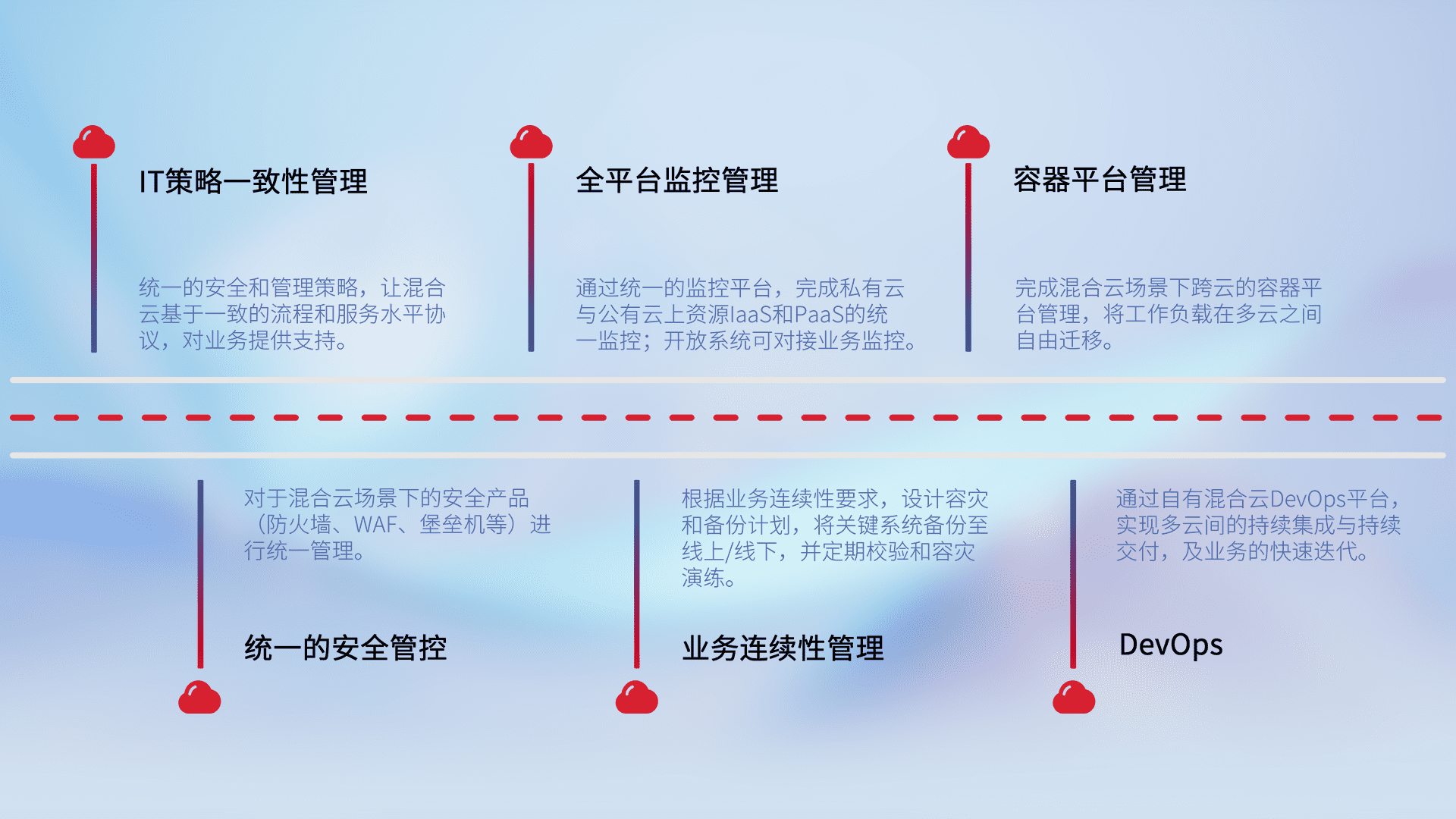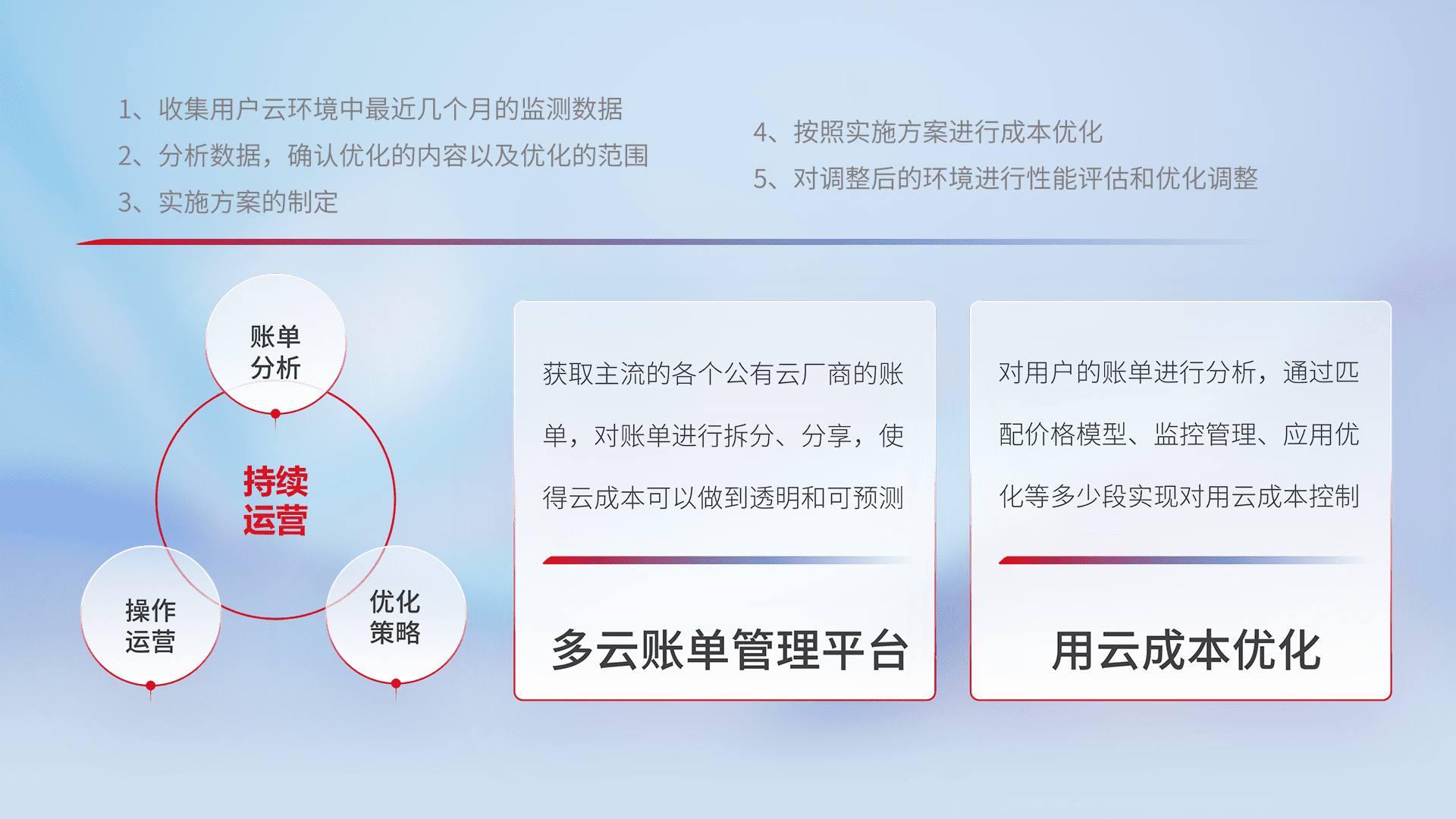 通过多云纳管,,,以统一的资源数据模型把客户的云资源进行抽象和封装,,,,进而实现对多云资源的统一操作,,保障云资源管理的可靠性、、稳定性与可用性。。。。量身定制化运维内容,,,,配置、、、、开发运维、、、、补丁管理、、、、备份、、、、监控、、、、认证和访问管理、、审计和日常巡检等,,保障在用云过程中的可靠度,,,稳定度以及高可用率。。。